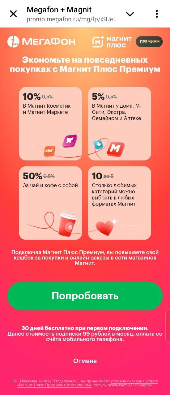 [RU] Magnit (Vitrin) 12 апреля 2026 GEO: Russian Federation Operator: [RU] Megafon Flow: 1 click Vertical: Mainstream Topic: Music CPA: 60 RUB Description: Выкуп всех активаций