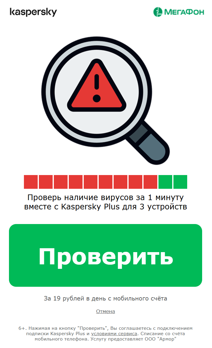 [RU] Kaspersky 19 (Loupe check) 12 April 2026 GEO: Russian Federation Operator: [RU] Megafon Flow: 1 click Vertical: Mainstream Topic: Utilities CPA: 55 RUB Description: EUP 19 rub day Обязательная передача sourceID и siteID