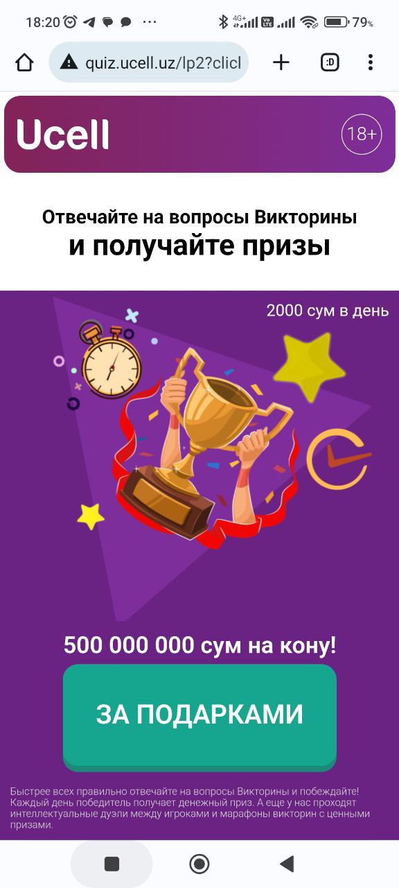 [UZ] Quiz (winner) 12 April 2026 GEO: Uzbekistan Operator: [UZ] Ucel Flow: 1 click Vertical: Mainstream Topic: Other CPA: 3 RUB Description: EUP 2000 сум в день