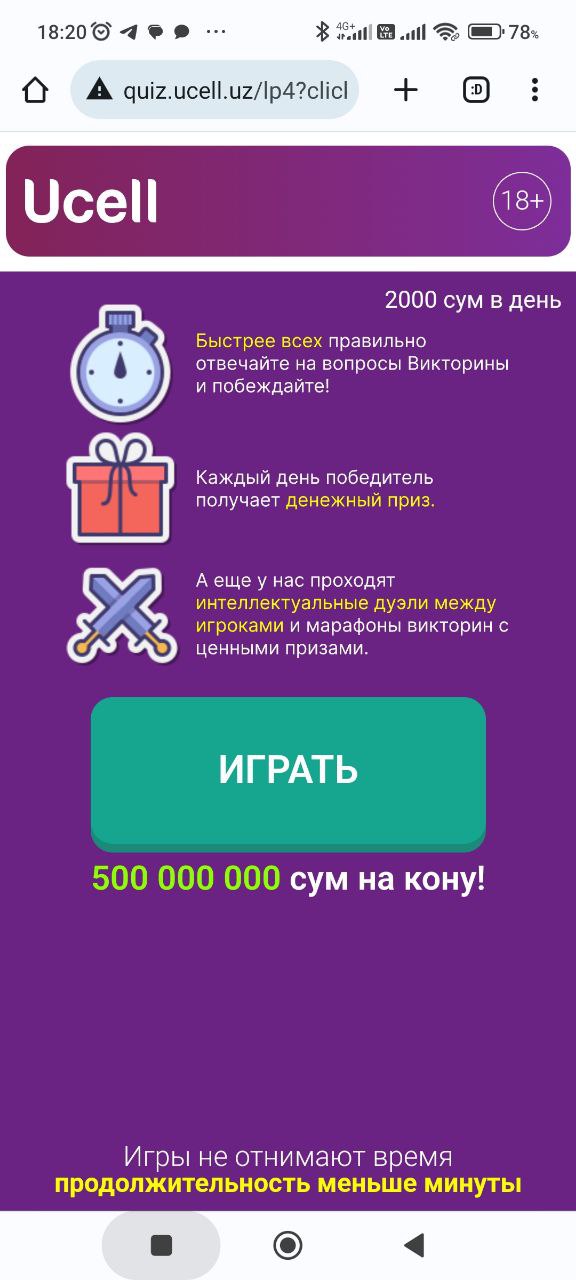 [UZ] Quiz (Play) 12 April 2026 GEO: Uzbekistan Operator: [UZ] Ucel Flow: 1 click Vertical: Mainstream Topic: Games CPA: 3 RUB Description: EUP 2000 сум в день