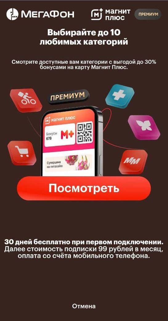 [RU] Magnit (Watch Category) 30 September 2025 GEO: Russian Federation Operator: [RU] Megafon Flow: 1 click Vertical: Mainstream Topic: Music CPA: 60 RUB Description: Выкуп всех активаций
